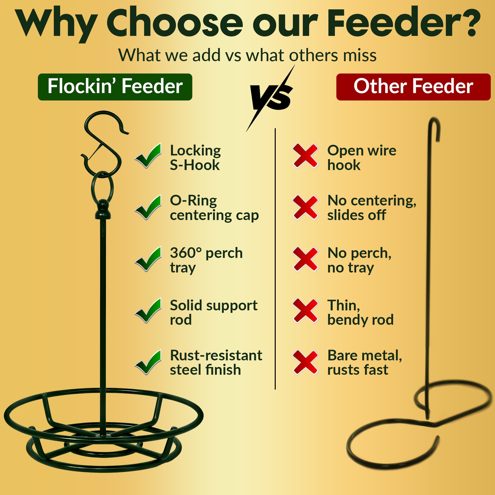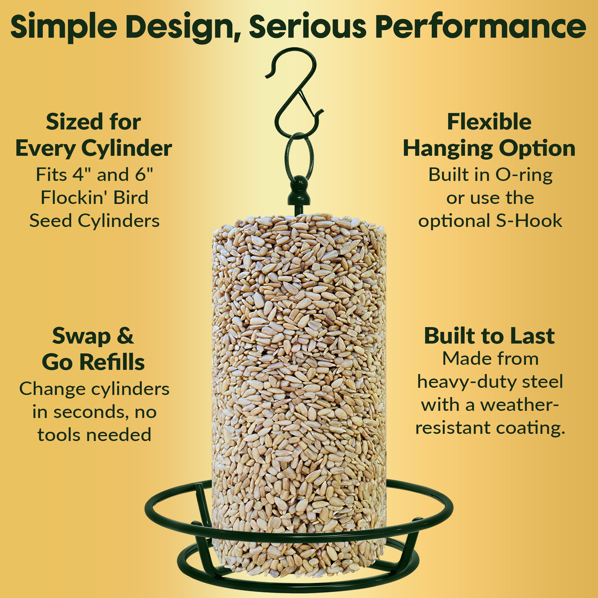 š¢ Built for Flockinā Cylinders ā Custom-designed to fit all Flockinā bird seed cylinders up to 6" wide, this heavy-duty metal feeder holds seed logs securely with no wobbling or slippingāperfect for our Spicy, Woodpecker, All Season, and other blends.