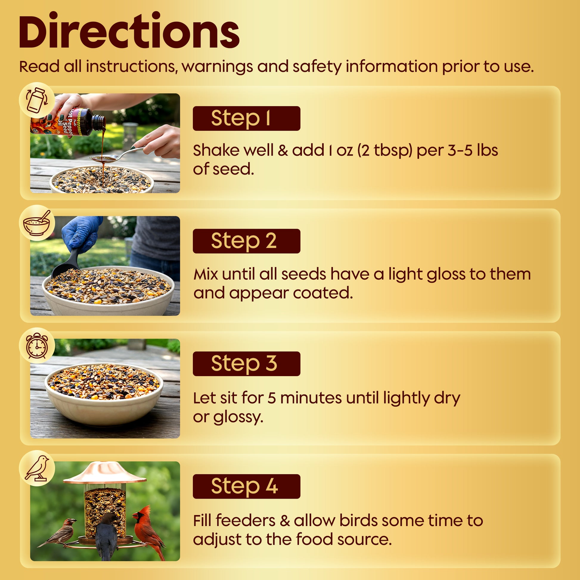 - 🧴 EASY TO MIX – A smooth, pourable oil that blends quickly with any wild bird food. Just drizzle, stir in a large bowl, and mix with the bird seed. One ounce of hot pepper oil treats 3 - 5 lbs of loose bird seed (read instructions).